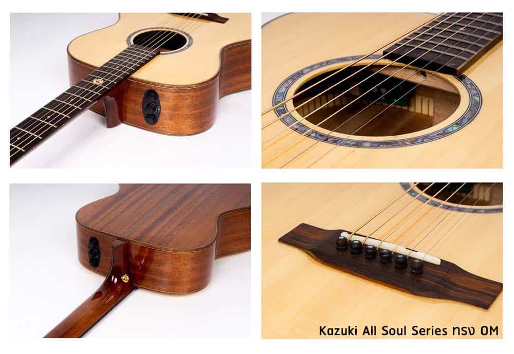 โดยสเปคหลักๆ ของ Kazuki All Soul Series นั้น ไม้หน้าทำด้วย Top Solid Sitka Spruce และไม้ด้านข้างด้านหลังเป็น Solid Mahogany ( ข้อดีของความเป็น Solid คือ เราจะได้เห็นพัฒนาการของเสียงที่ดีขึ้นเเรื่อยๆ ยิ่งเล่นยิ่งเสียงดีขึ้นทุกวัน )